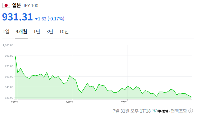 현재 100엔당 환율은 약 930~940원 수준으로, 비교적 안정적인 상태를 유지하고 있습니다.
